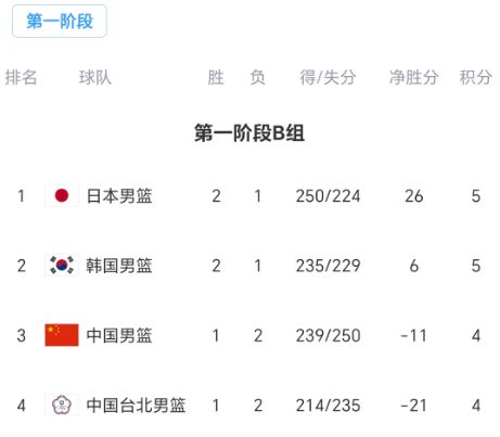 B组三轮过后,日本队、韩国队都是2胜1负,都在本轮遭遇首场败仗,中国队、中国台北队都是1胜2负,都在本轮取得首场胜利,最新积分榜如下: