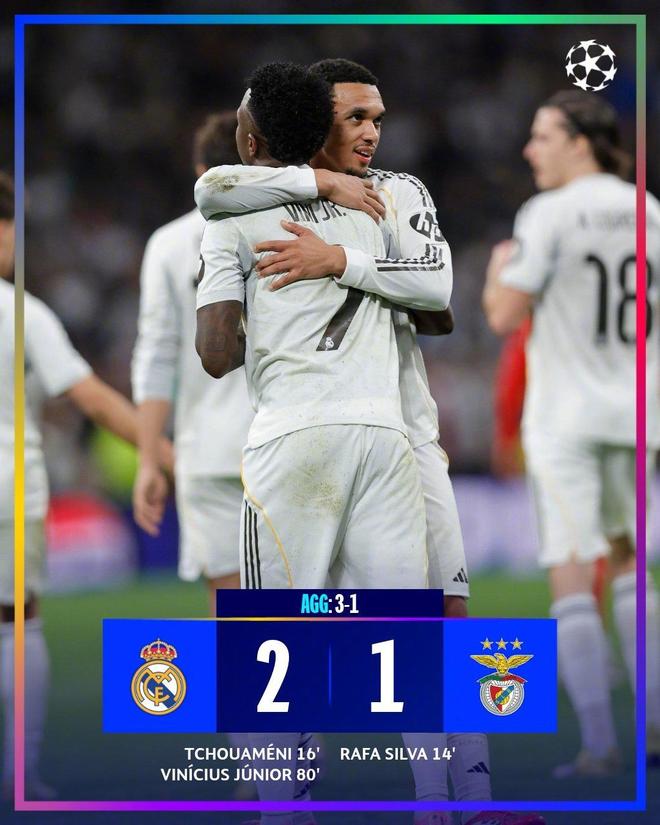 最终,皇家马德里2-1再次战胜本菲卡,两回合双杀对手,总比分3-1晋级16强。下一场淘汰赛皇家马德里的对手将是葡萄牙体育或者曼城。