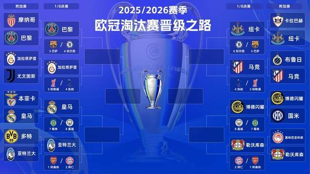 北京时间2026年2月26日消息。欧洲冠军杯在上赛季进行了改制:从32强的传统8个小组,变成了先打36强的联赛制,再打淘汰赛附加赛。——这样,附加赛连续两个赛季出现名局。上赛季,皇马和曼城提前相遇,结果安切洛蒂率队6-3击败瓜迪奥拉。而本赛季,这样的巅峰对决出现多场。包括本菲卡VS皇马,大巴黎VS摩纳哥,尤文图斯VS加拉塔萨雷。